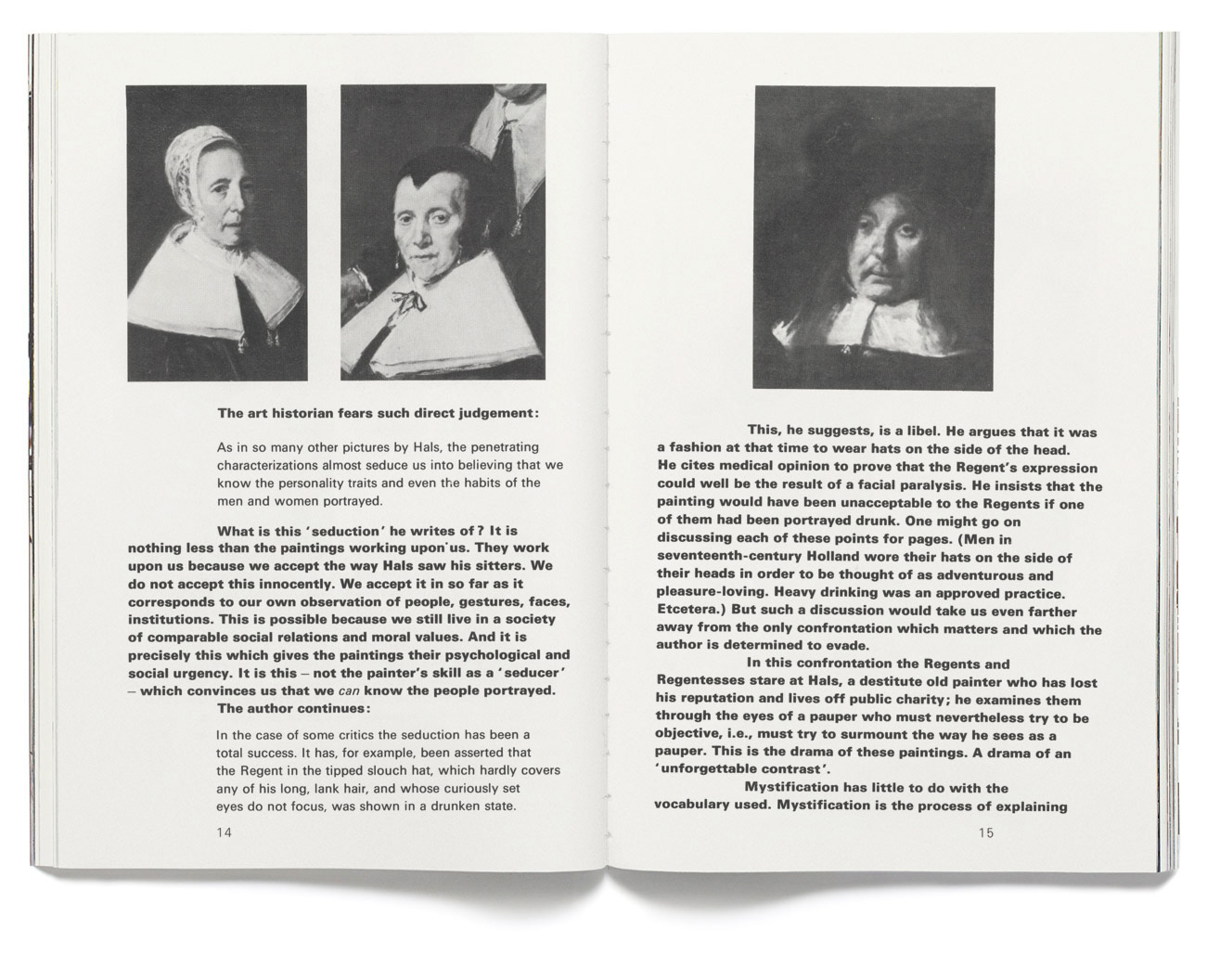 Most interesting to me is the choice to typeset the book in a bold weight of Univers, justified by Hollis as an attempt to give the text the same color and weight as images. The printed design choices are meant to mimic the dual stream of television: being able to simultaneously see an image and hear a word.