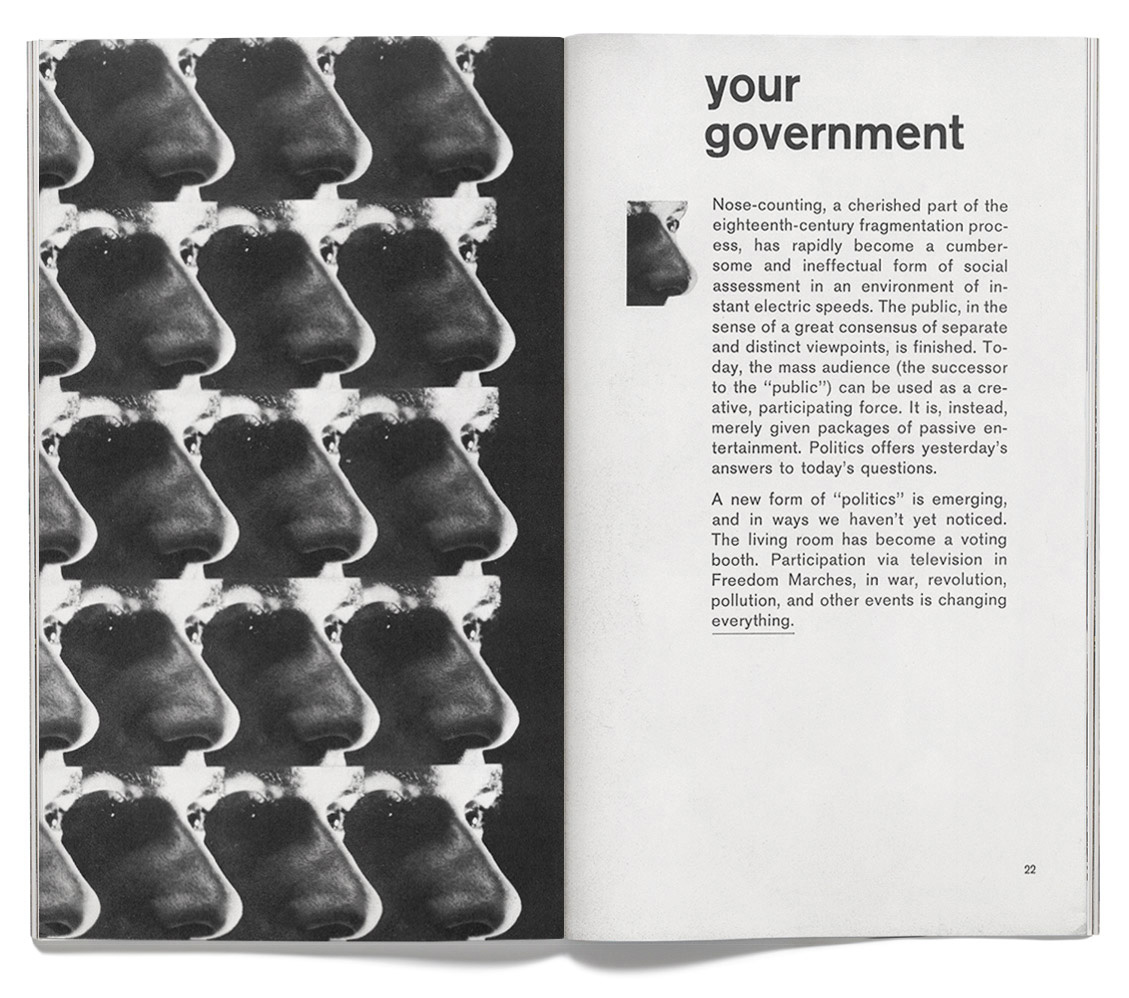 I discovered the more rare titles in Agel’s production portfolio a few years ago, and they have aged very well: their design approach to visuals and authorship seem to be just as appropriate today as they were in the late ’60s. But a question kept coming up when I considered the books in the context of the visual literacy we now all possess by being steeped in this multi-media internet. I kept asking myself: Why aren’t designers still making work like this?